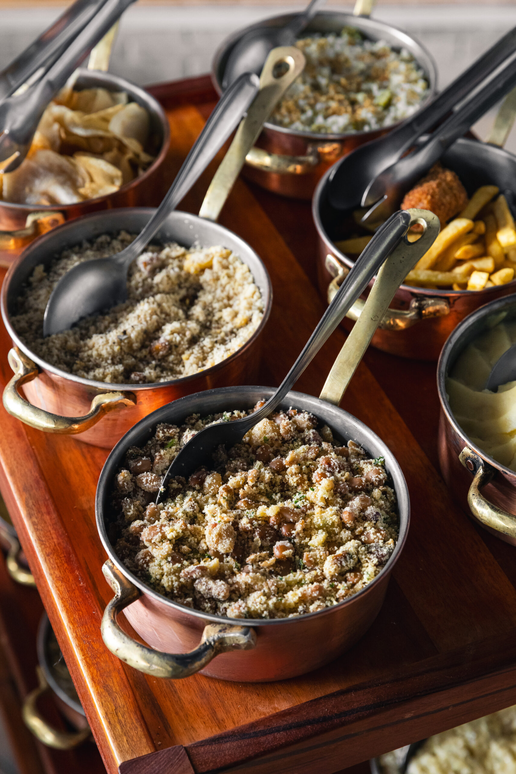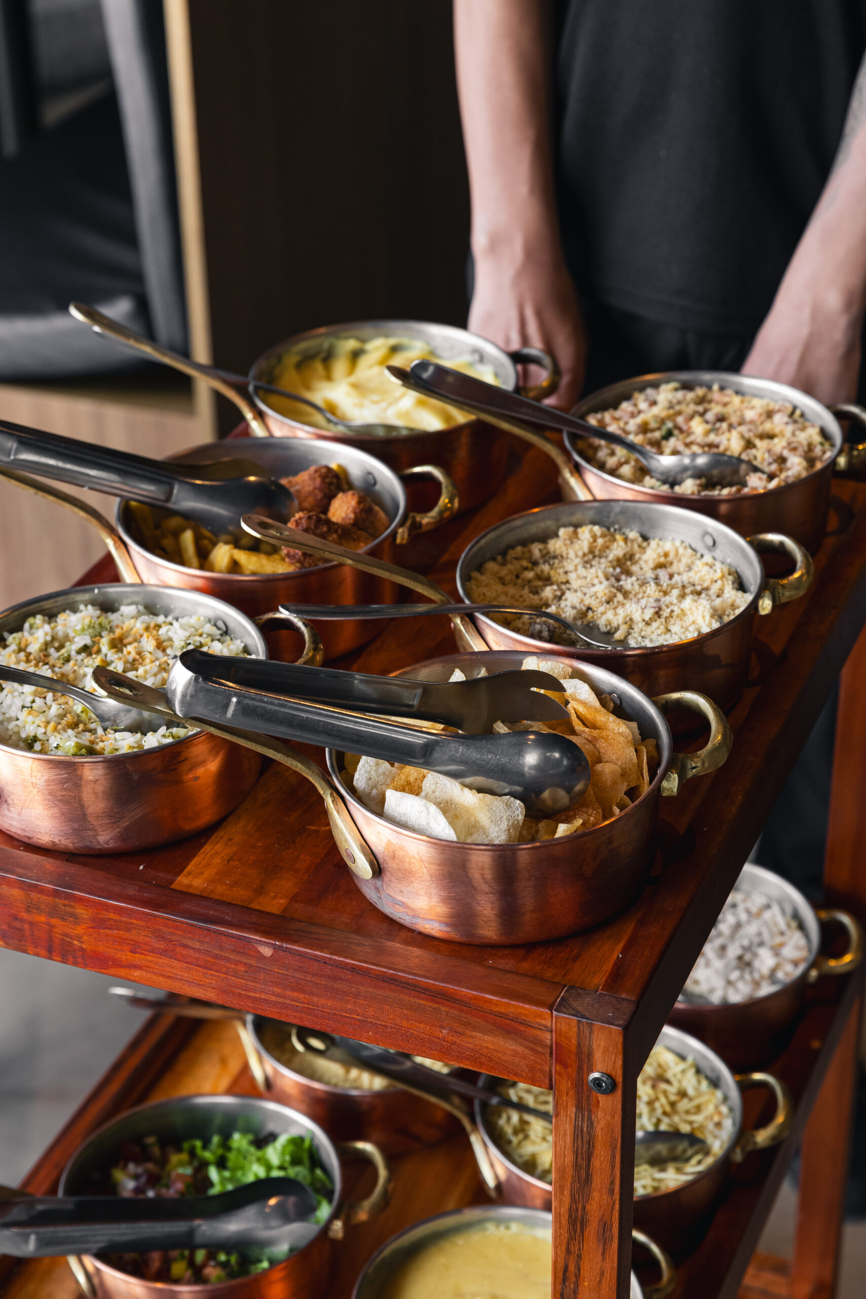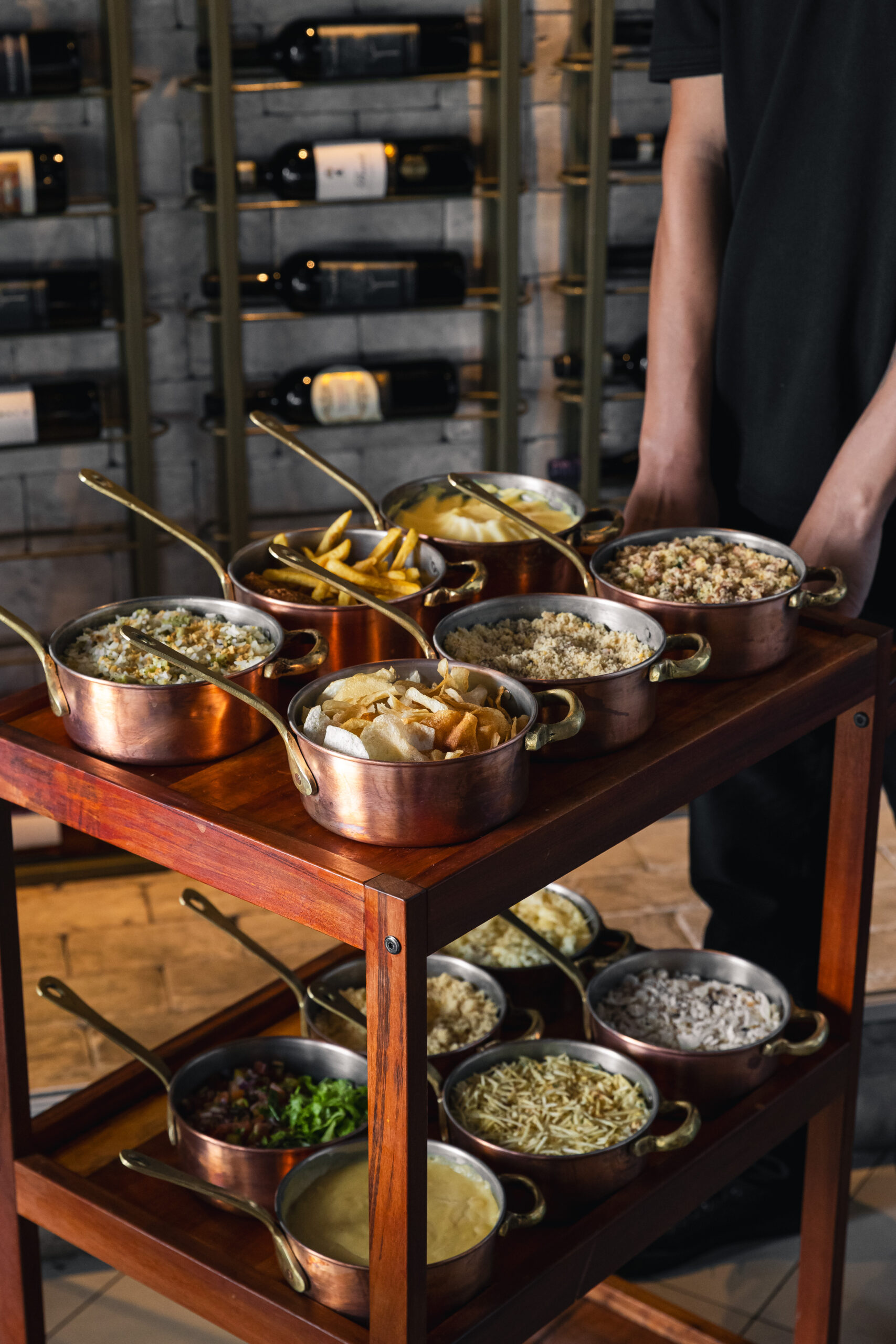 Um carrinho exclusivo circula entre as mesas, servindo 14 guarnições à vontade.Elegância em movimento — o companheiro perfeito das carnes EZZA.